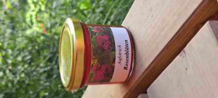 Rosenblüten-Aufstrich ist ein herrlich duftender Brotaufstrich. Der Rosenblüten-Aufstrich steht nur in begrenzter Menge zur Verfügung. Frisch aus meinem Garten, werden die Englischen Duftrosen und die Wildrosen zu diesem herrlichen Aufstrich verarbeitet. Das Rosenblüten-Aufstrich zaubert uns den Sommer auf den Frühstückstisch.